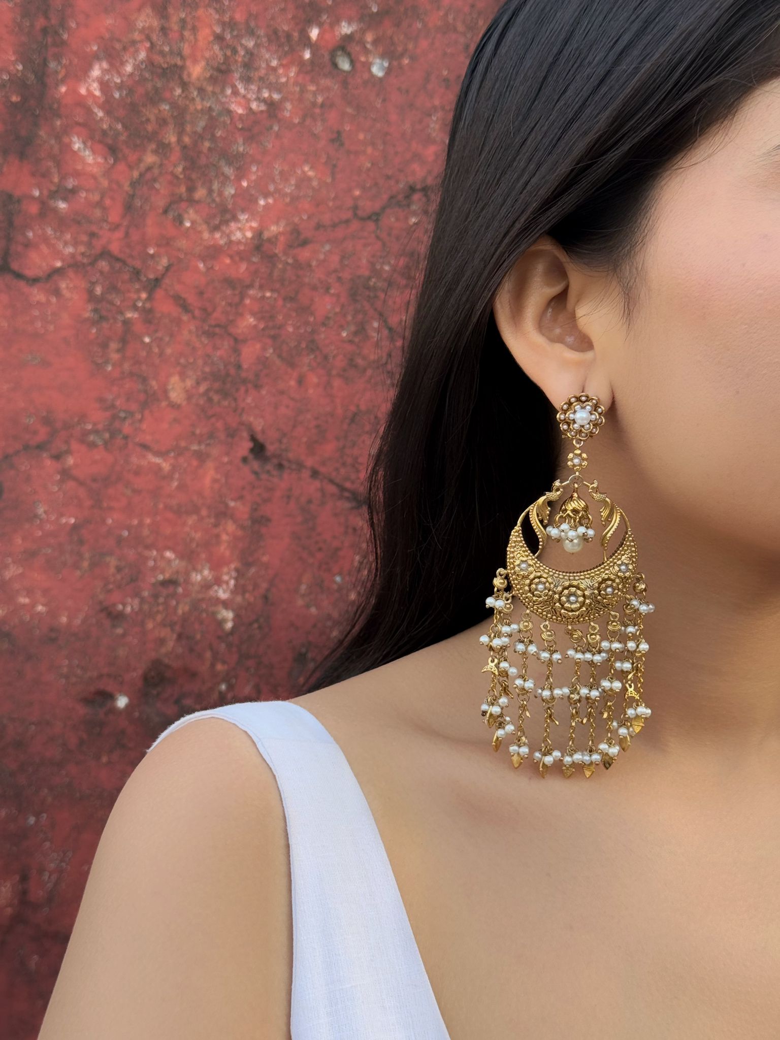 The Royal Peacock Chandbali Earrings embody elegance and tradition with a stunning blend of intricate floral filigree and cascading pearl embellishments. Designed in a grand crescent shape, these earrings feature ornate gold detailing, delicate chain tassels, and a regal peacock motif, symbolising grace and prosperity. The exquisite craftsmanship adds a vintage charm, making these earrings a timeless statement piece for weddings, festive occasions, and royal soirées. Let your style shine with the opulence of heritage and artistry.